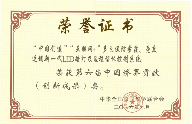 Our R & D and manufacturing of "China creation" "Internet plus" color temperature and brightness. Anti fog and haze of a new generation of LED lights and remote intelligent control system in September 2016 won the sixth session of Chinese overseas Chinese contribution (innovation) award.