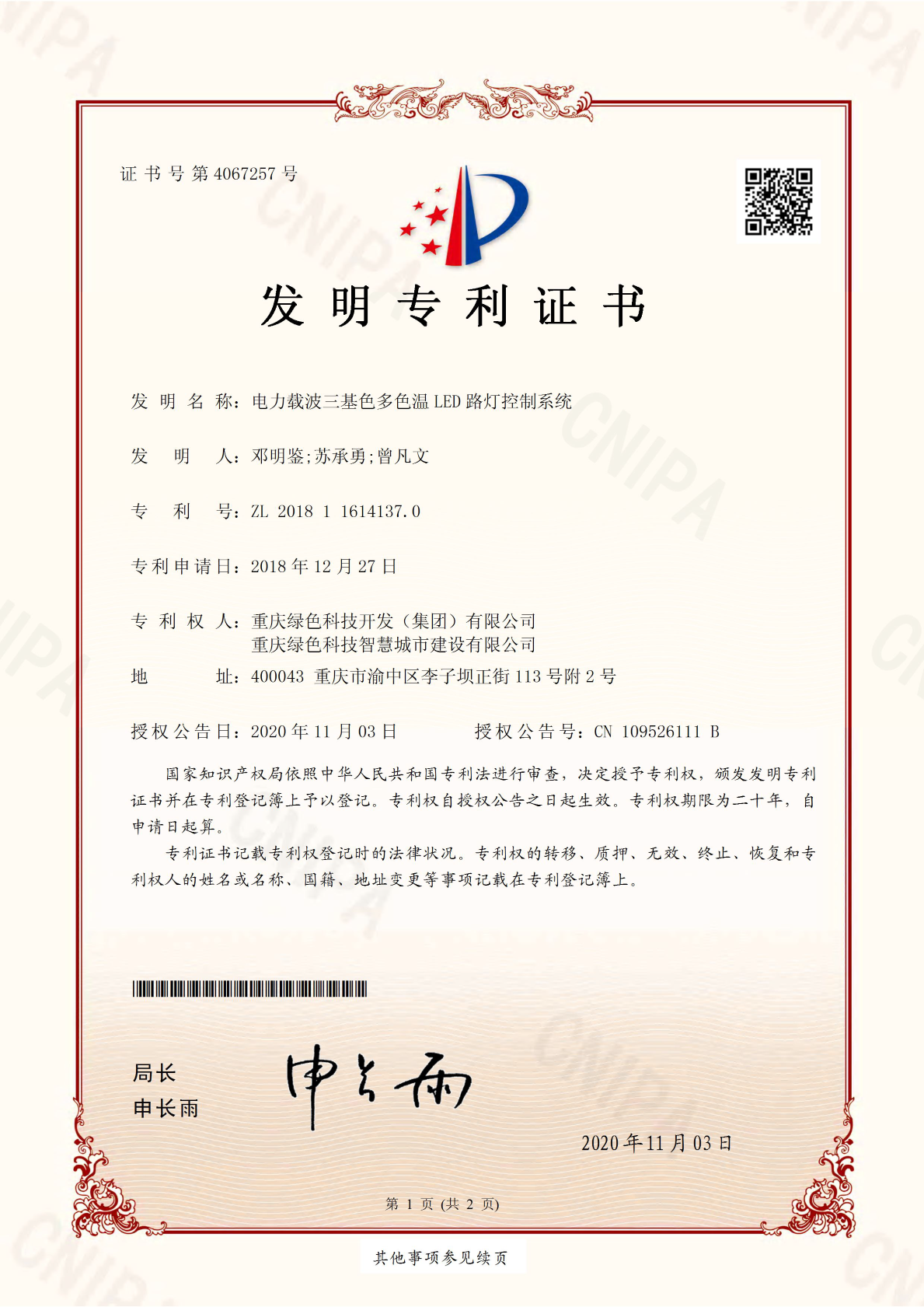 近日,重慶綠色科技開發(fā)(集團(tuán))有限公司再度喜獲一項(xiàng)國家發(fā)明專利《電力載波三基色多色溫LED路燈控制系統(tǒng)》(專利號(hào):ZL 2018 1 1614137.0)。